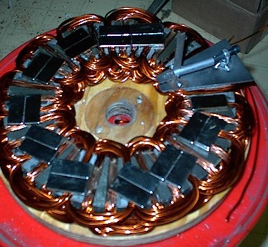 This is the beginning test of a full size poured stator. I've done some small ones in the past for stirling engine projects but never really followed up on them. Bob Gayle inspired me to follow up on it to see if would really perform equally as well as a steel slotted stator. Initial tests are showing some losses over the steel core but with the ease of fabricating it may well be worth the efficiency loss over labor involved with the steel slotted cores. Here is a picture of the poured core stator ....